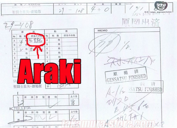 accompagné d'une photocopie du time shart montrant que le responsable genga était Araki Shingo.